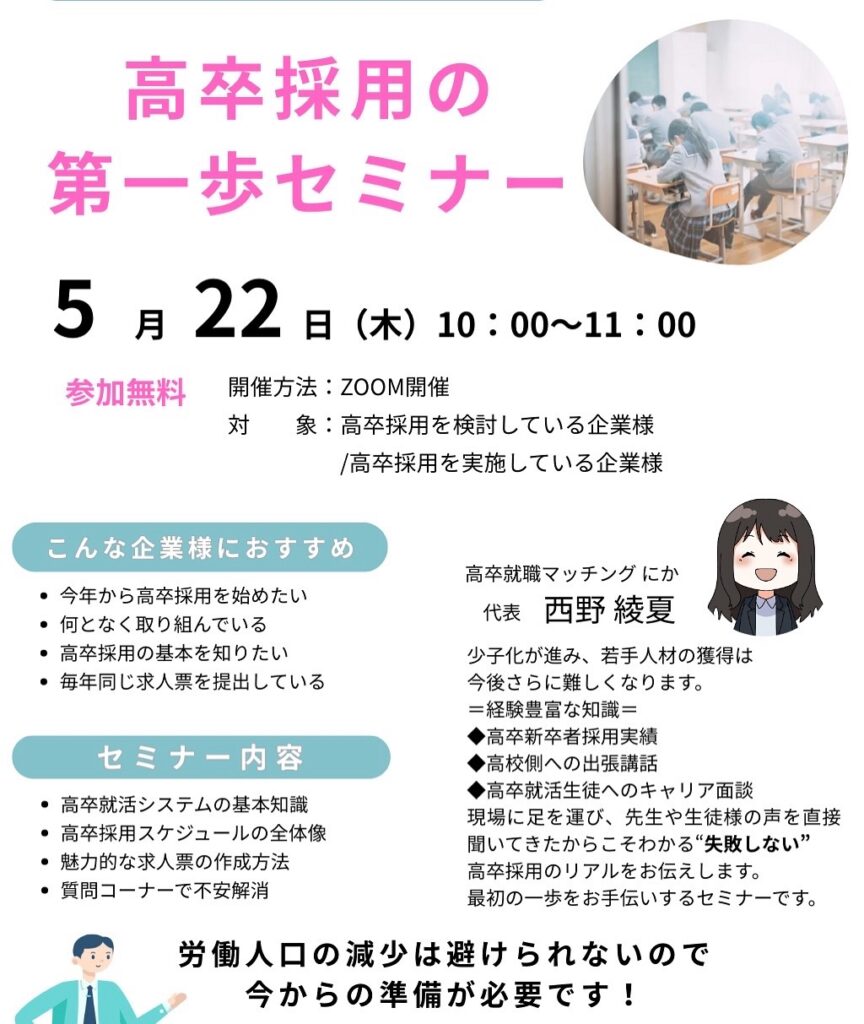 高卒採用企業様、検討企業様に向けた、オンライン勉強会を開催いたします。令和8年度の採用に向けて、・高卒採用の基本スケジュール・魅力的な求人票の書き方